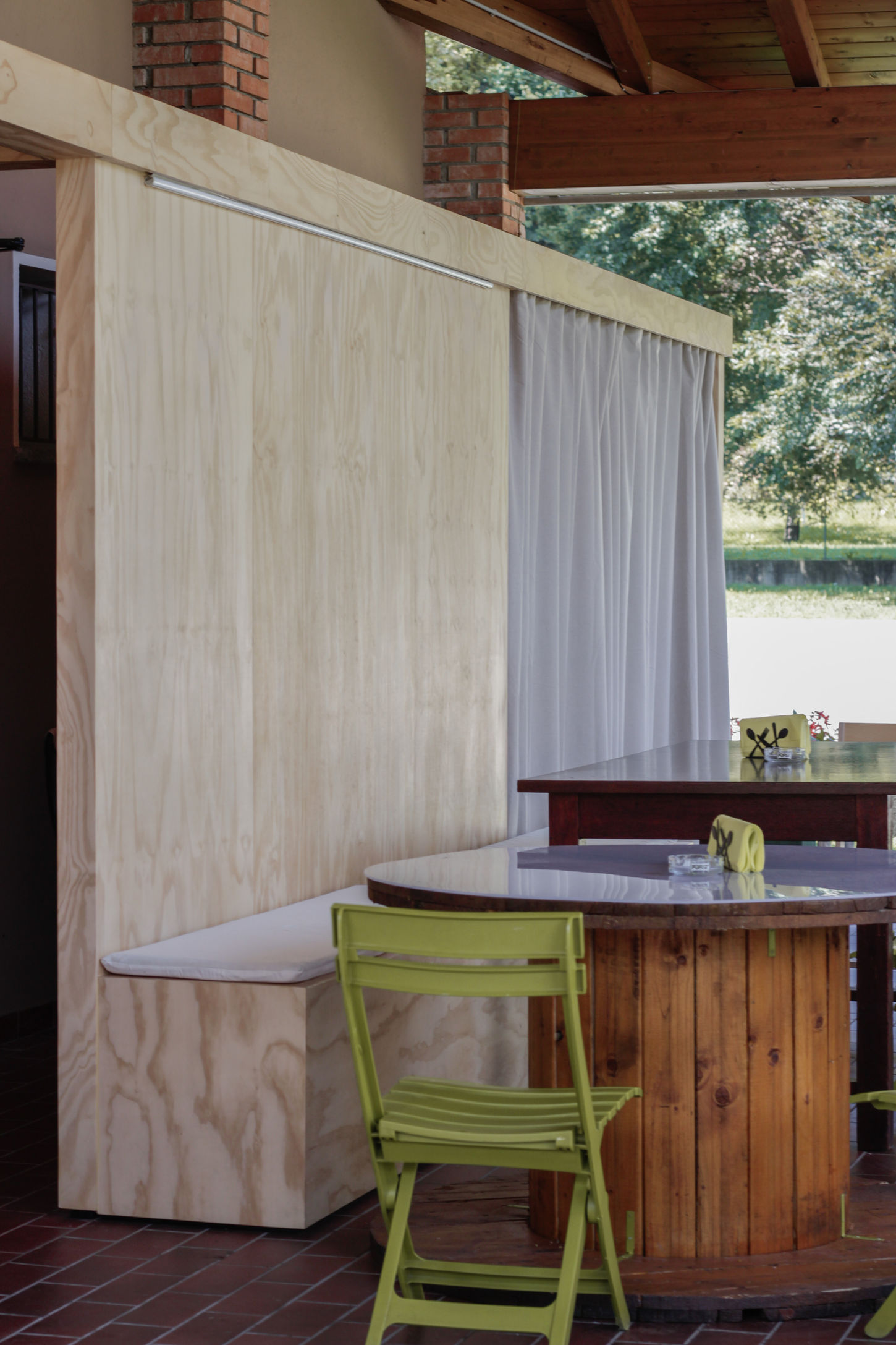 Un luogo sospeso tra interno ed esterno, uno spazio coperto, ma immerso nel paesaggio. Il bar a Comabbio in provincia di Varese ridefinisce il concetto di spazio e accoglienza. Protagonista del progetto è un arredo in pino russo, che mette in relazione le aperture esistenti e forma una quinta scenica continua, dando unità e carattere all’intero ambiente.