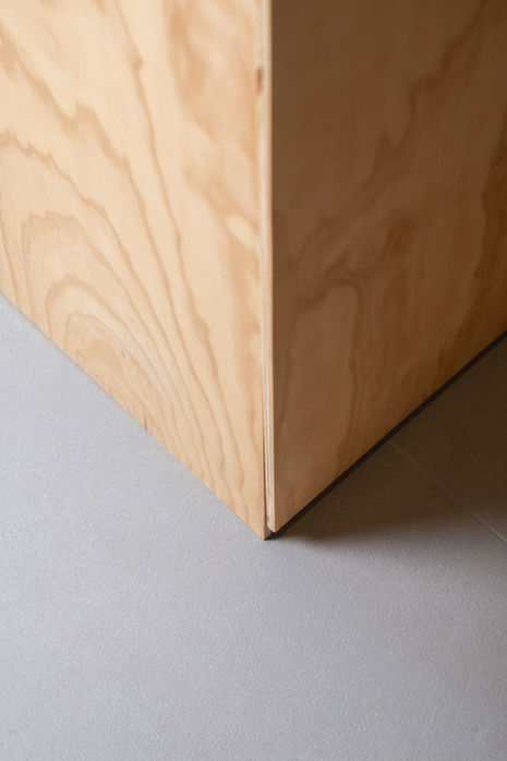 Elemento centrale dello spazio è il grande mobile in pino fenolico, protagonista indiscusso che, oltre a organizzare la distribuzione interna, segna con decisione il passaggio tra l’area di ingresso e la zona operativa.